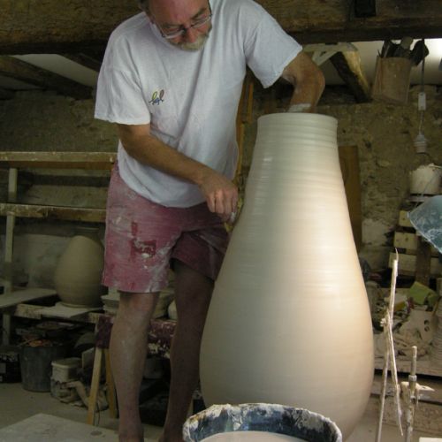 À part les pots de jardins qui sont en grès ou en terre réfractaire, toute sa production est en porcelaine. Il prépare lui-même ses terres et sa porcelaine qu’il cuit à 1320°.